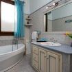 INSIDE: Entrance to the living area with dining room, built-in kitchen and relaxation corner with sofa. A hallway leads to the sleeping area with three bedrooms, two of which are double and one single. Two bathrooms, with shower and corner bathtub. Prestigious "old america" furniture and finishes in warm amber tones of wood with "sky blue" accessories characterize this holiday home.
